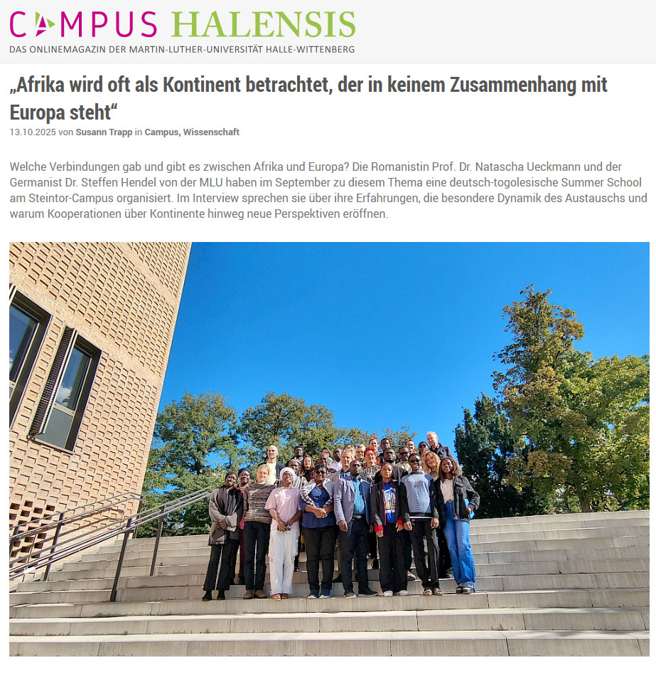 13.10.2026 – Die Universitätszeitung CAMPUS HALENSIS interwiewt Natascha Ueckmann und Steffen Hendel zur deutsch-togoischen Universitätskooperation. Anlass war die Summer School Wissenszirkulationen und Erinnerungspraxen zwischen Afrika und Europa mit Kolleg:innen, Promovierenden, Studierenden sowie Gästen aus Togo und Deutschland: „Afrika wird oft als Kontinent betrachtet, der in keinem Zusammenhang mit Europa steht“