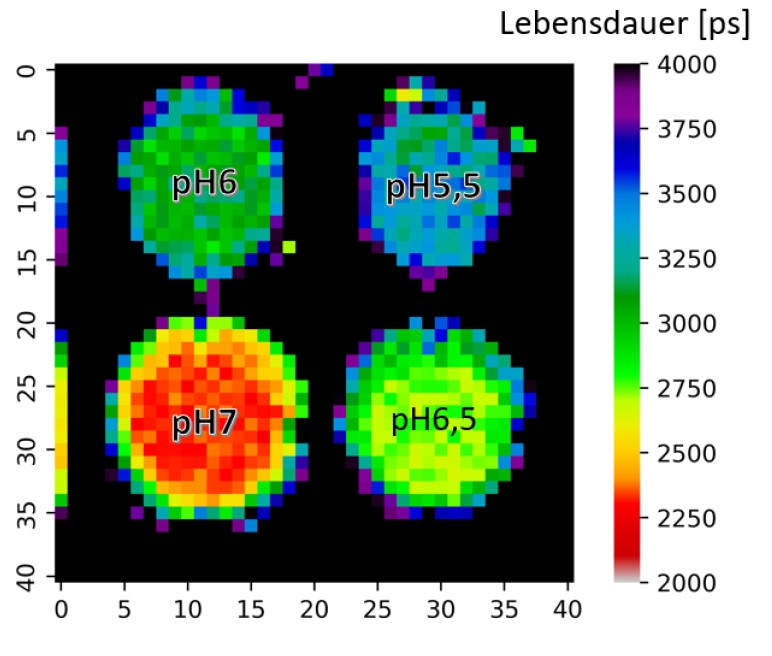 The Figure shows a lifetime plot of the pH values in a microwell plate determined with time resolved fluorescence tomography and pH sensitive marker molecules (fluorescein-isothiocyanate, FITC)