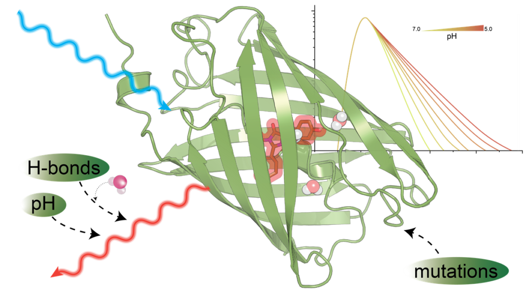 Molecular dynamics (MD) at different protonation states rationalize the observed photophysics and give rise to understanding the role of specific amino acids in stabilisation of the chromophore and modulation of the excited-state proton transfer (ESPT) efficiency, providing a mechanistic basis for pH-sensitive lifetime and insensity measurements.