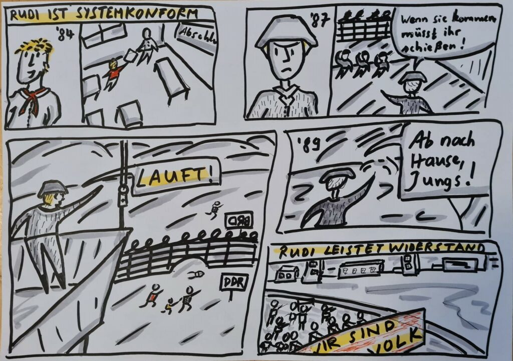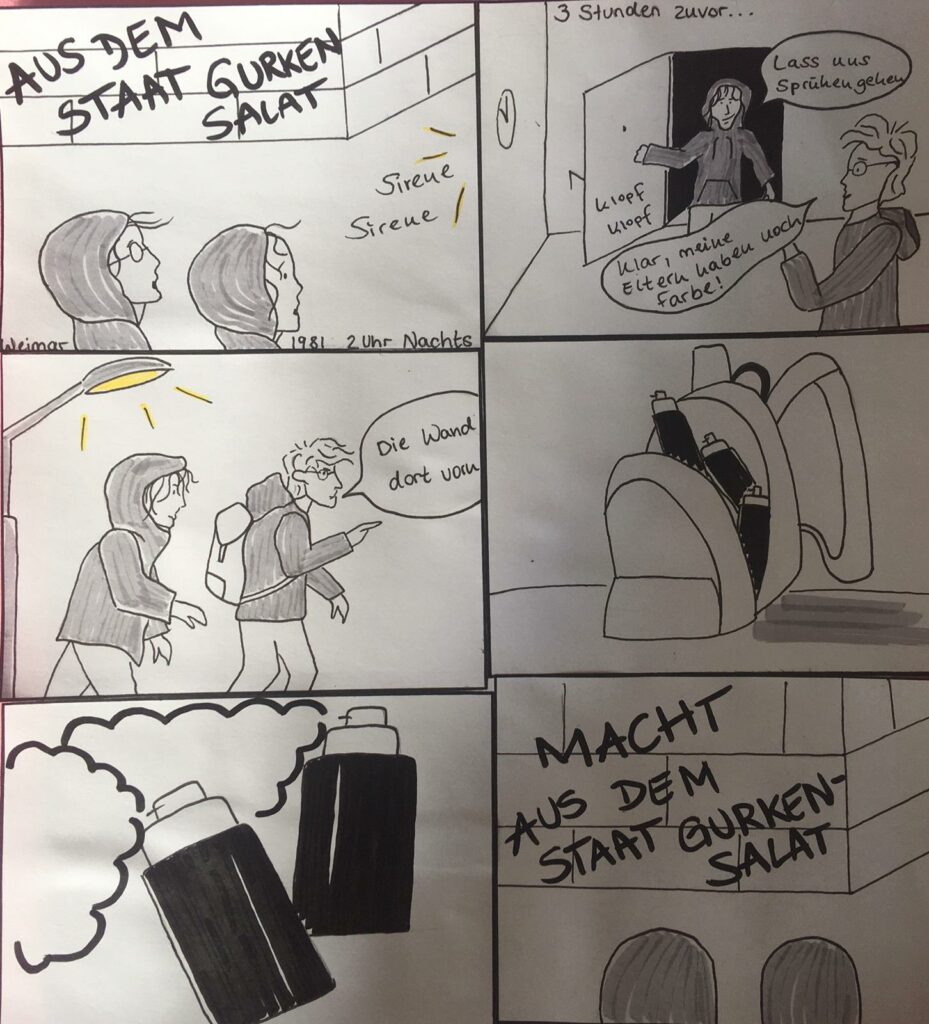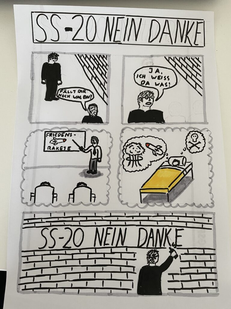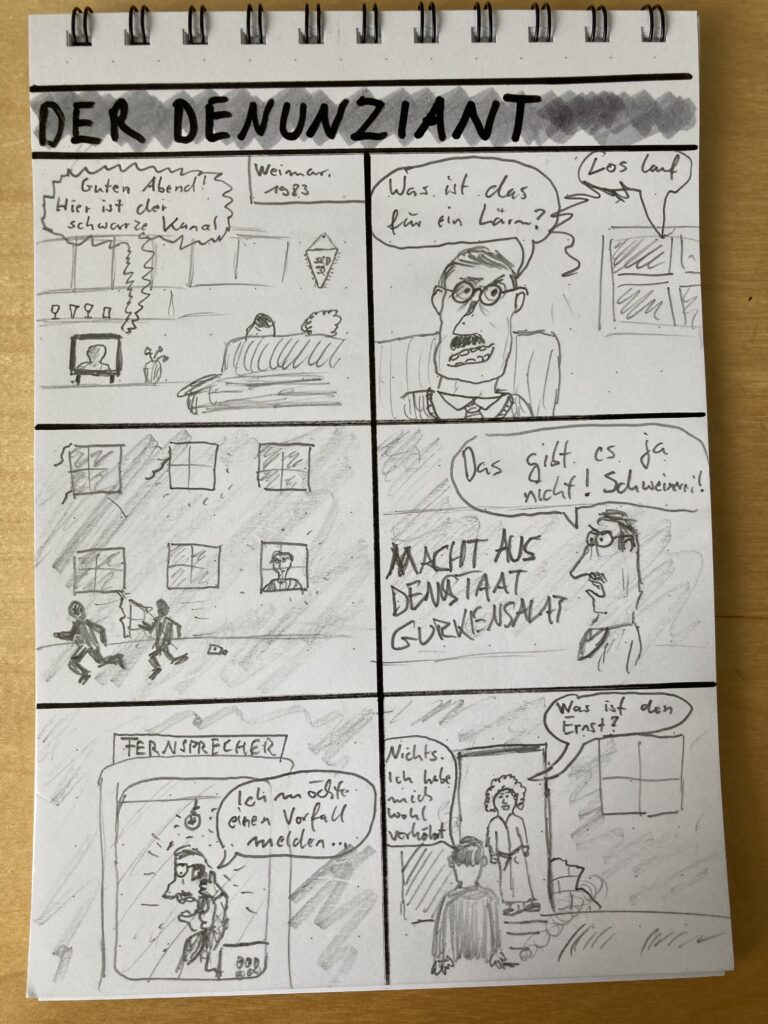 Schritt 3: Sich Zeit nehmen, um Skizze in einen kleinen Comic zu verwandeln. Hierzu ein kleiner Tipp aus eigener Erfahrung, immer genügend Platz für Sprechblasen und Schrift einplanen.