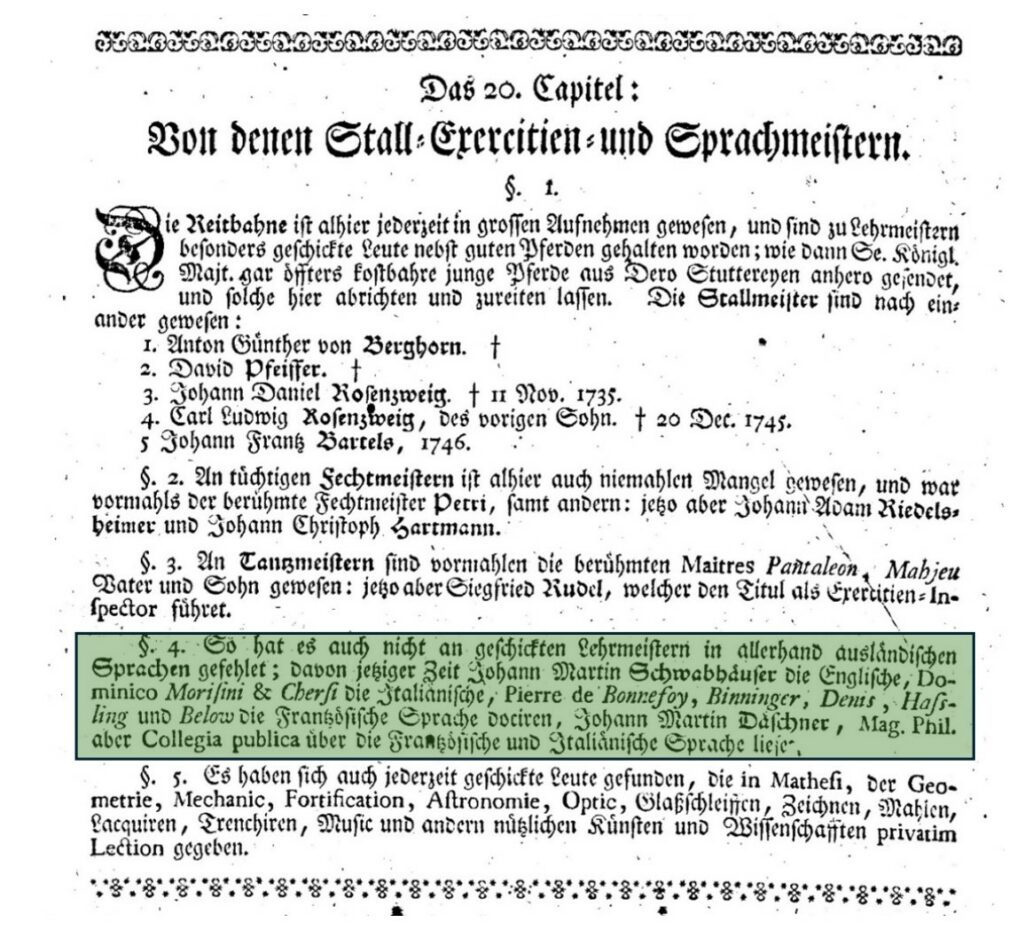 Nach den Stall-, Fecht- und Tanzmeistern werden die Sprachmeister namentlich auch in der berühmten Dreyhauptschen Chronik genannt (§ 4):