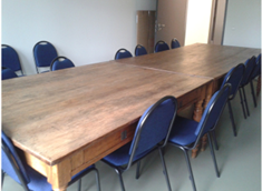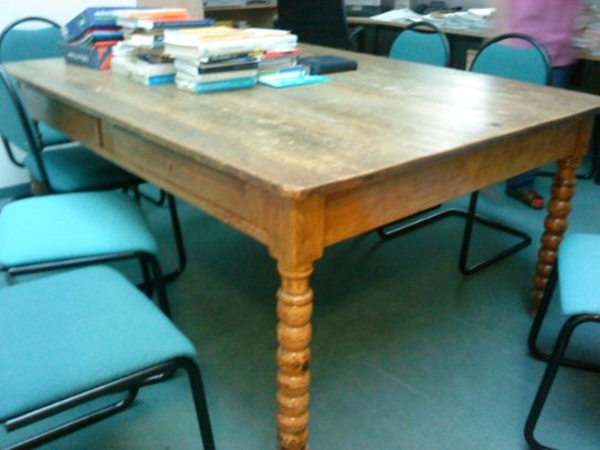 2015 sammelten zwei Kolleg*innen anlässlich „runder“ Geburtstage Spenden. So konnten die Tische aus der Dachritzstraße abgeholt und fachmännisch restauriert – auch die Schubladen sind wieder nutzbar – zum Steintor-Campus gebracht werden, wo sie heute im Besprechungsraum des Instituts stehen.