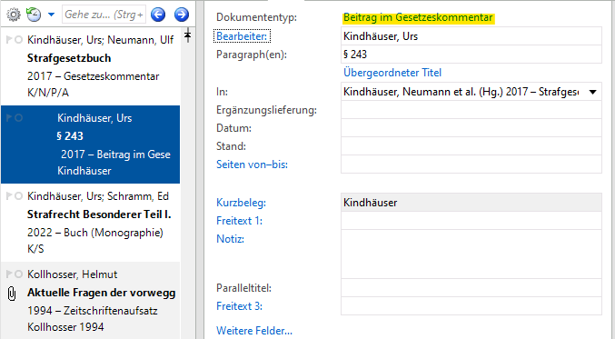 - Verfasser von Kommentaren, die ihren Kommentar ohne weitere Bearbeiter verfasst haben (wie z. B. der Fischer StGB-Kommentar oder sämtliche Kommentare aus der Studienkommentar-Reihe des Beck-Verlags) werden unter dem Dokumententyp „Monographie“ erfasst. Warum? Weil unter dem Dokumententyp „Gesetzeskommentar“ hinter dem Namen von z. B. Herrn Fischer noch ein „(Hrsg.)“ und der Verweis auf den übergeordneten Kommentar folgen würde und das ist bei dieser Art von Kommentaren fehl am Platz. Wenn ihr dann einen kommentierten Paragraphen zitieren wollt, dann schreibt in das Feld „Seiten von – bis“ des Zitats einfach den Paragraphen sowie die dazugehörige Randnummer.