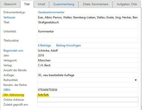 Bei Gesetzeskommentaren kommt es außerdem häufiger vor, dass bestimmte Herausgebernamen abgekürzt ausgegeben werden, z. B. der Schönke/Schröder wird zu Sch/Sch in der Fußnote. Diese Abkürzung kannst du im Feld „übliche Abkürzung“ beim Gesetzeskommentar eintragen, hier demnach Sch/Sch. In der Fußnote sähe das dann folgendermaßen aus: Bosch, in: Sch/Sch, § ….