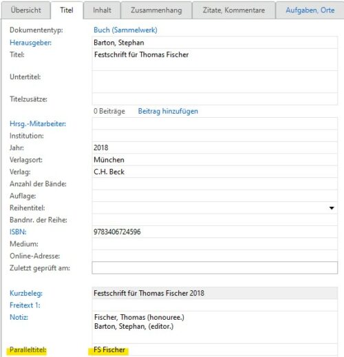 - Verfasser von Kommentaren, die ihren Kommentar ohne weitere Bearbeiter verfasst haben (wie z. B. der Fischer StGB-Kommentar oder sämtliche Kommentare aus der Studienkommentar-Reihe des Beck-Verlags) werden unter dem Dokumententyp „Monographie“ erfasst. Warum? Weil unter dem Dokumententyp „Gesetzeskommentar“ hinter dem Namen von z. B. Herrn Fischer noch ein „(Hrsg.)“ und der Verweis auf den übergeordneten Kommentar folgen würde und das ist bei dieser Art von Kommentaren fehl am Platz. Wenn ihr dann einen kommentierten Paragraphen zitieren wollt, dann schreibt in das Feld „Seiten von – bis“ des Zitats einfach den Paragraphen sowie die dazugehörige Randnummer.